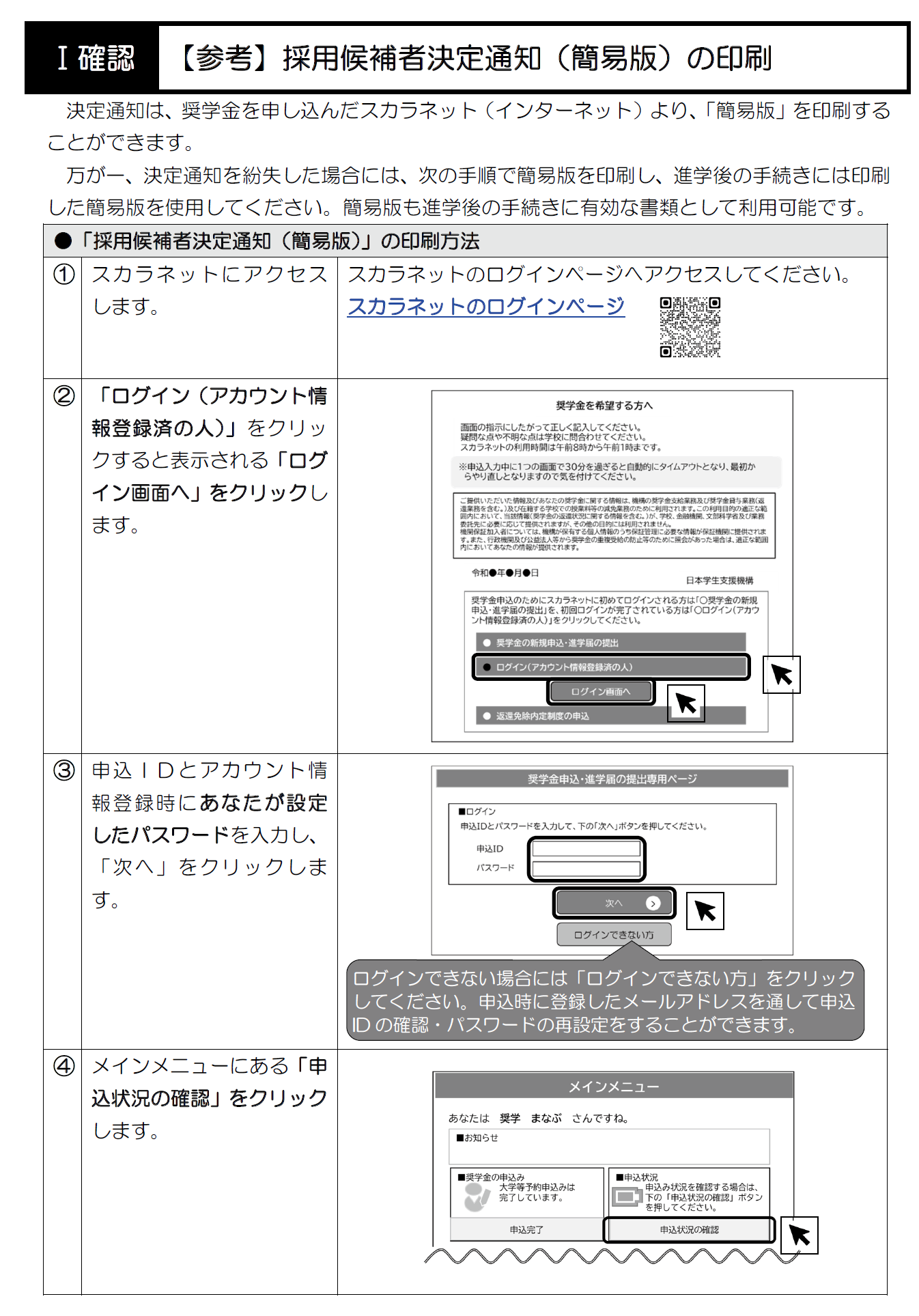 「採用候補者決定通知」は、奨学金を申し込んだスカラネット(インターネットサイト)より、簡易版を印刷することができます。