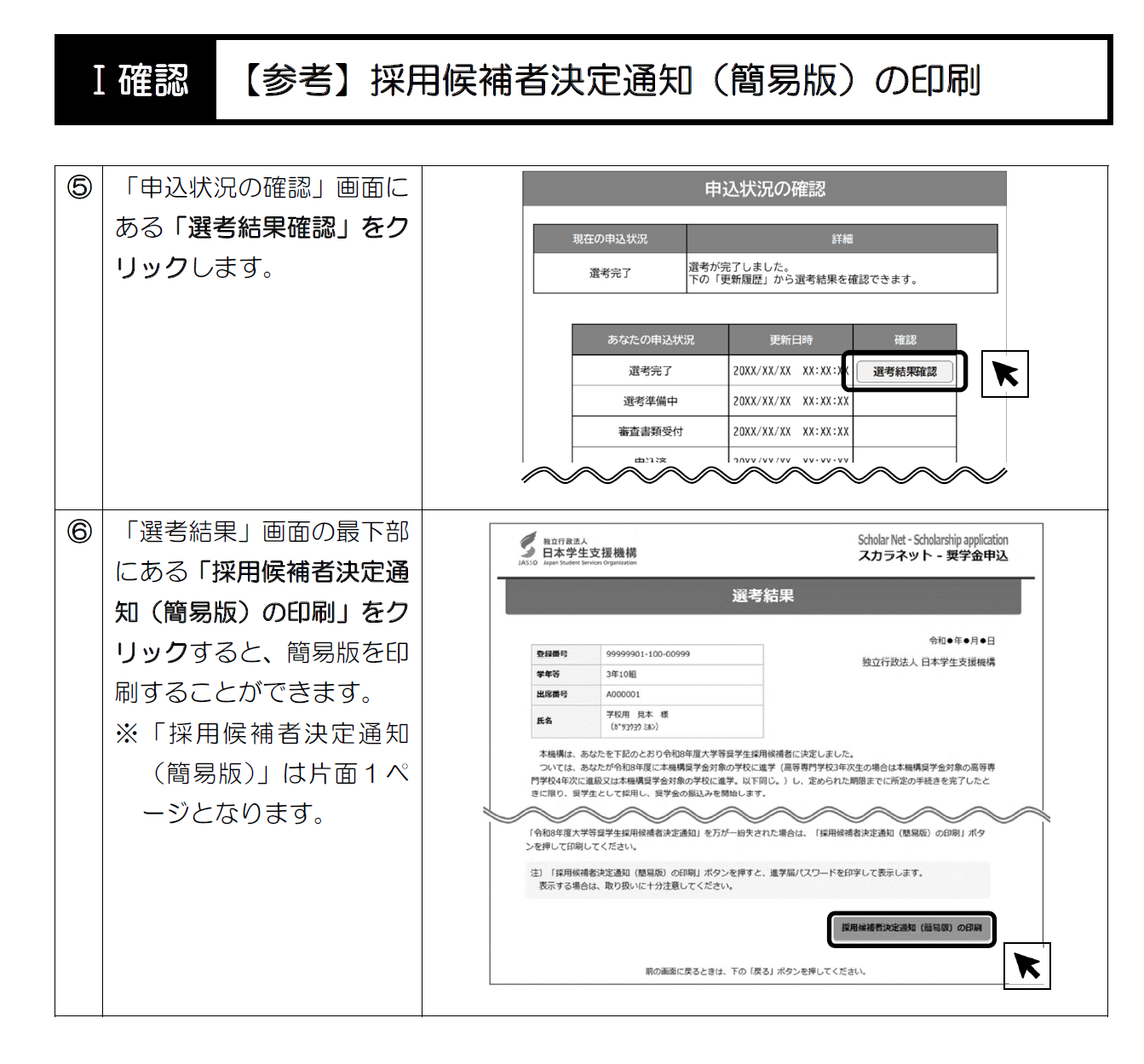 【参考】採用候補者決定通知(簡易版)の印刷(※給付奨学生採用候補者のしおり5~6ページ)
